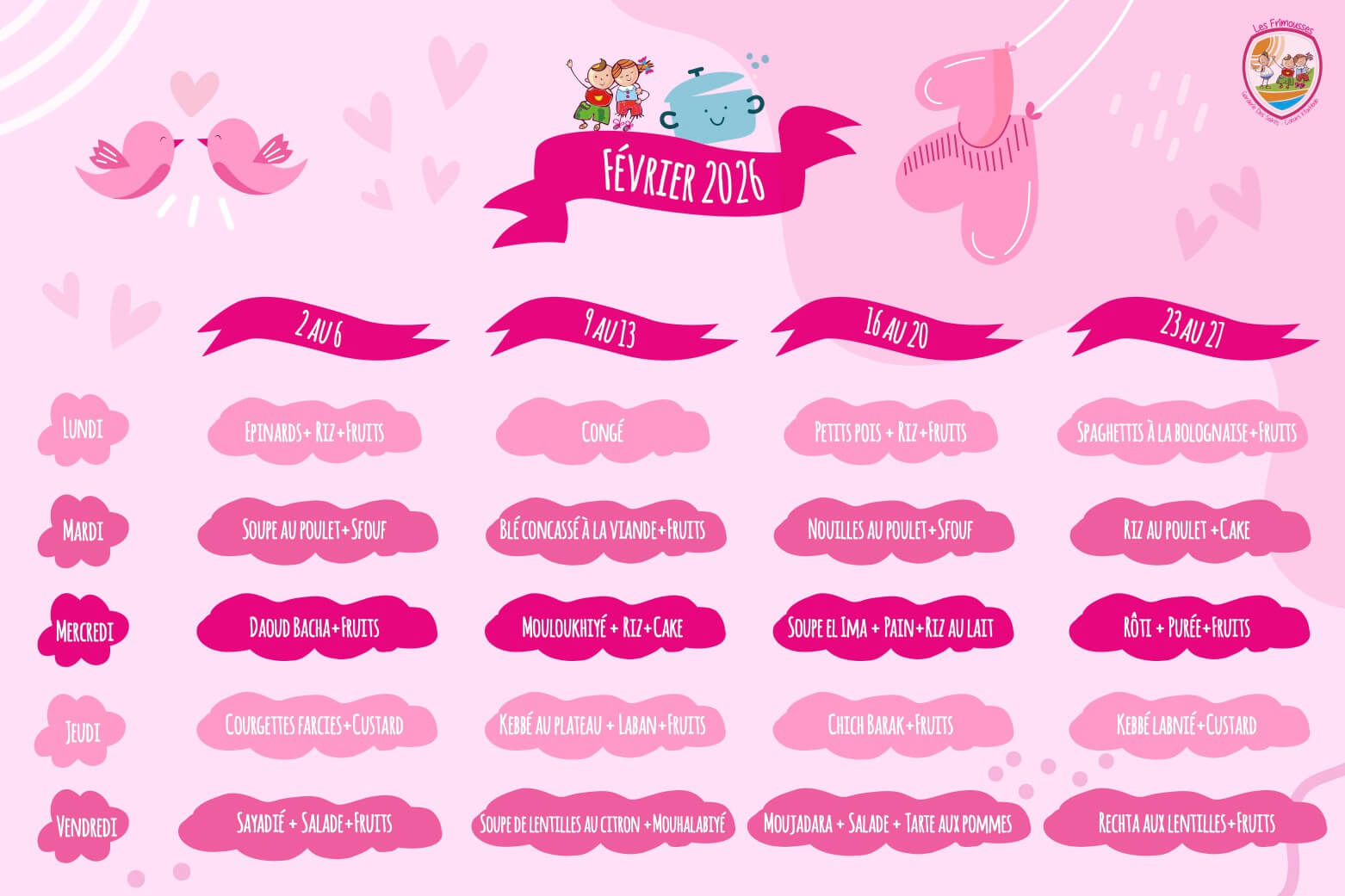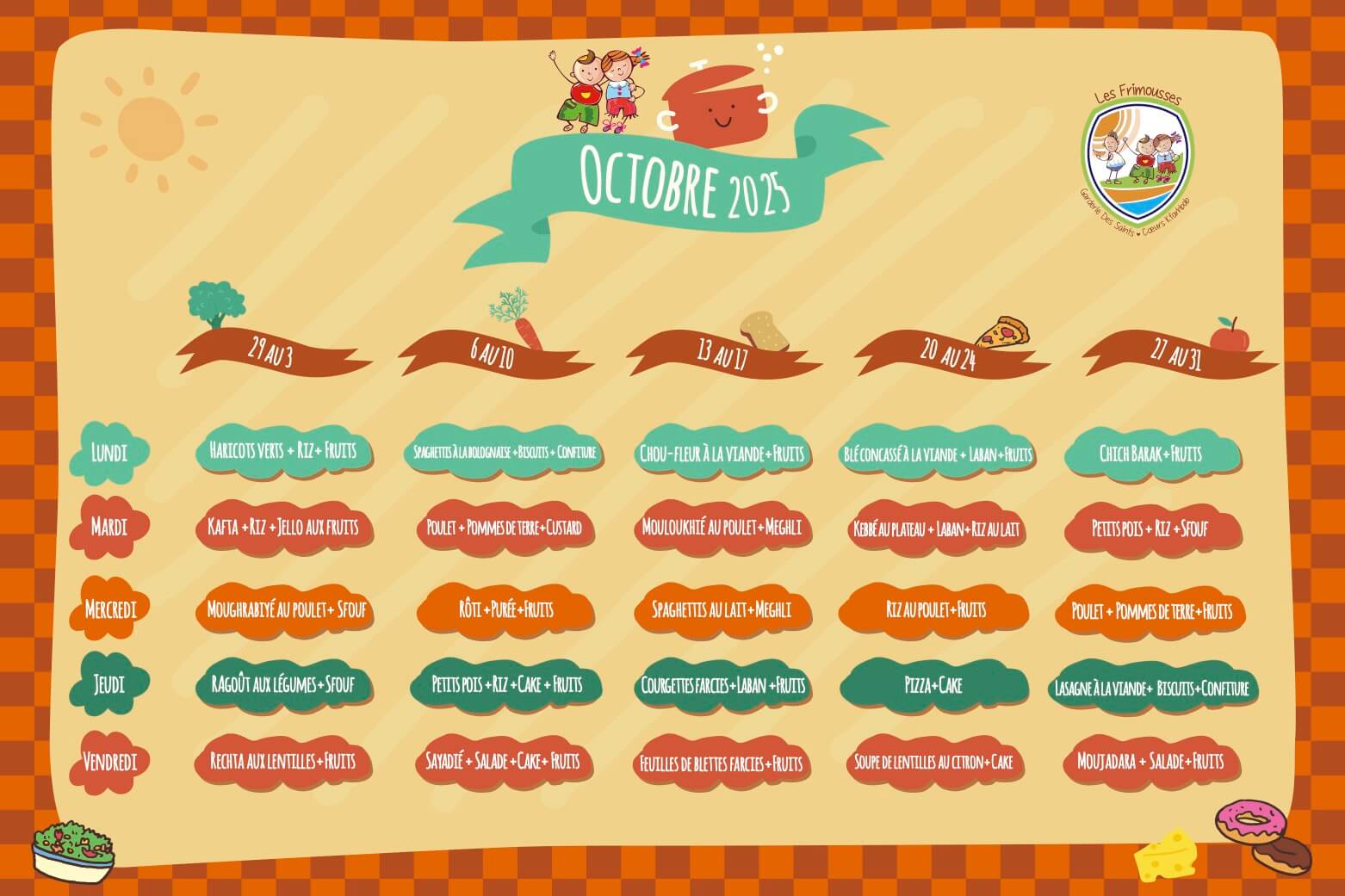 La garderie comporte deux réfectoires: l’un reçoit les enfants âgés de 1an-2ans, l’autre ceux âgés de 2ans-3ans. Ils distribuent tous deux des plats sains et équilibrés par jour. A cet égard, un menu mensuel est établi par la responsable et approuvé par le pédiatre dans le souci de présenter aux enfants un apport alimentaire complet basé sur les éléments principaux du menu recommandé et sur la meilleure répartition des aliments.