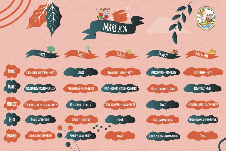 La garderie comporte deux réfectoires: l’un reçoit les enfants âgés de 1an-2ans, l’autre ceux âgés de 2ans-3ans. Ils distribuent tous deux des plats sains et équilibrés par jour. A cet égard, un menu mensuel est établi par la responsable et approuvé par le pédiatre dans le souci de présenter aux enfants un apport alimentaire complet basé sur les éléments principaux du menu recommandé et sur la meilleure répartition des aliments.